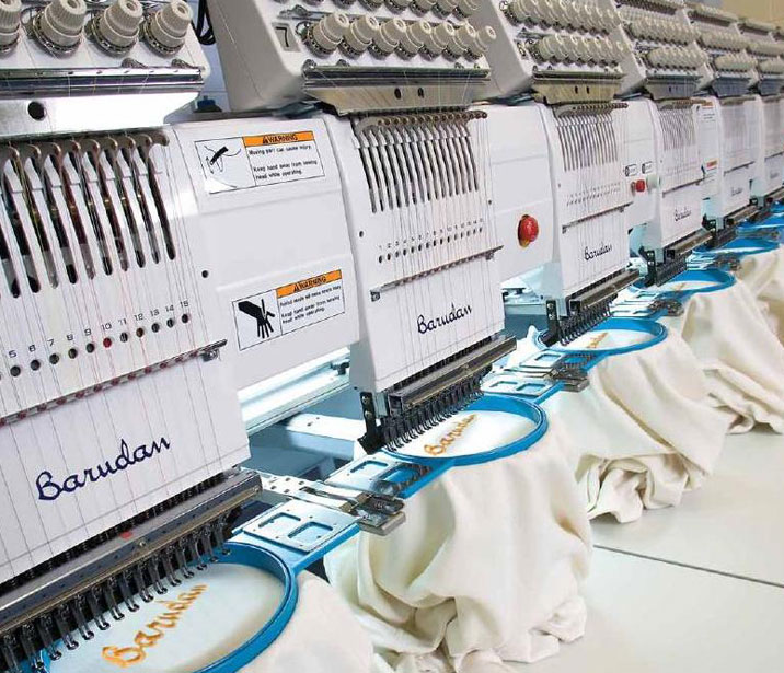 Computerised multi head embroidery machines to make chain, loop stitch and chenneli designs up to 8-9 colors on Japanese make Barudan machine.Hand embroidery designs with sequence work, beads…Stone fixing, rhime stones, heat transfer photo & flock prints.